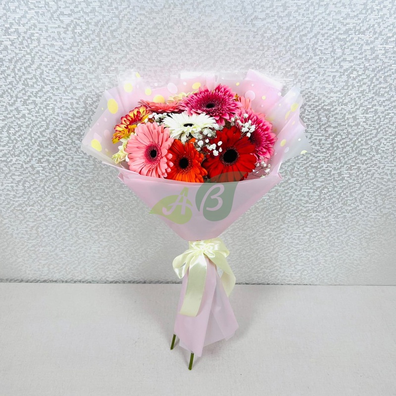 Букет из 13 гербер и 1 веточки гипсофилы в упаковке. Гармоничное сочетание цветов в букете будоражит чувства, поднимает настроение и дарит яркие эмоции. Такой букет  вдохновляет на подвиги и придаёт сил на новые свершения.