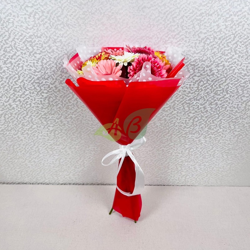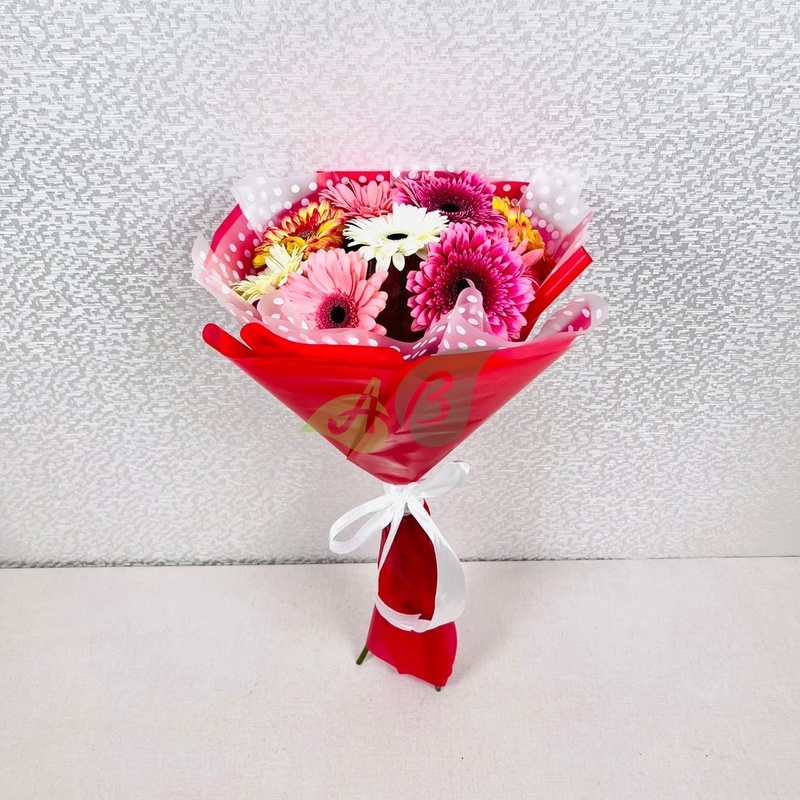 - Гербера - 11 штук, цвет - красный, жёлтый, оранжевый, длина стебля - 50 см;