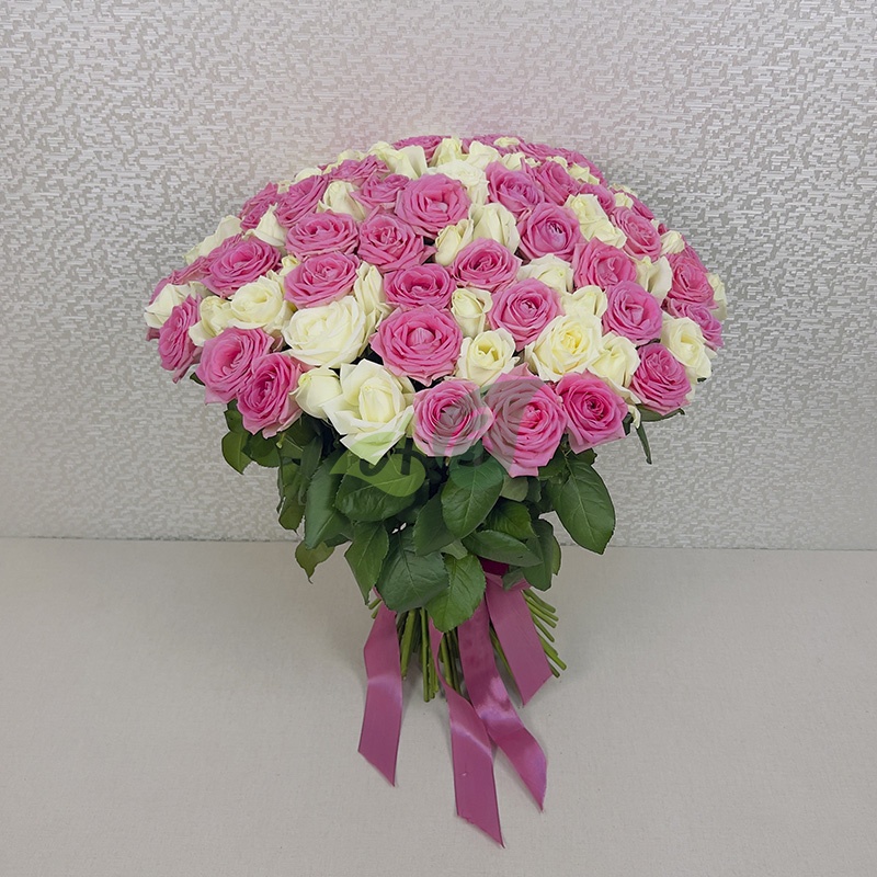 Букет из 101 розовой и белой розы станет замечательным подарком ко дню свадьбы. Нежные цветы в шикарной композиции тщательно отобраны нашими флористами. Мы понимаем, как важно, чтобы букет выглядел достойно и никогда не используем несвежие или увядшие бутоны.