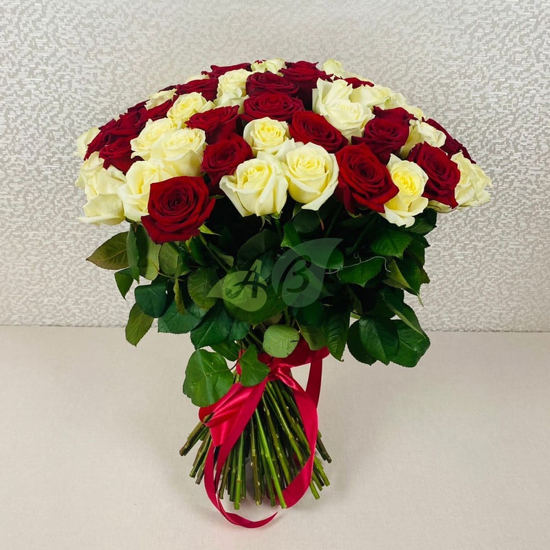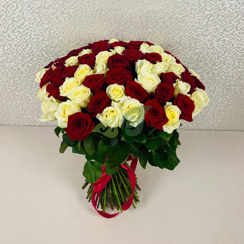 Изысканное сочетание в одном огромном букете из 101 бутона красных и белых роз одинакового размера обозначает гармонию двух начал – мужского и женского, страсть в любви, единение не только душ, но и тел. Такой букет намекает на дальнейшие пылкие отношения в паре, полное взаимопонимание, взаимовыручку и поддержку друг друга в любой ситуации.
