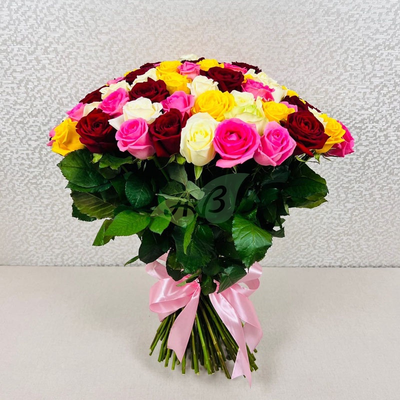 Свежие красные, розовые и желтые розы в единой композиции из 101 штуки будут радовать получателя не один день. А их аромат напомнит о весне.