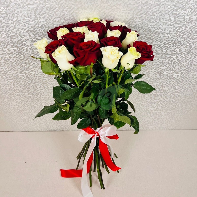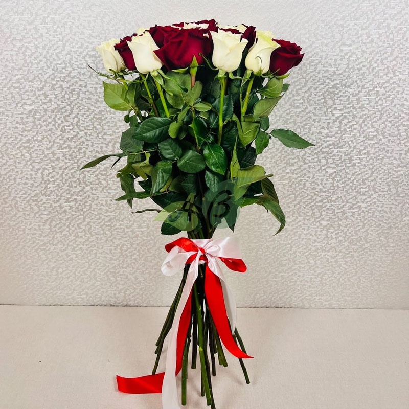 Состав и характеристики букета 25 красных и белых роз "Эквадор":