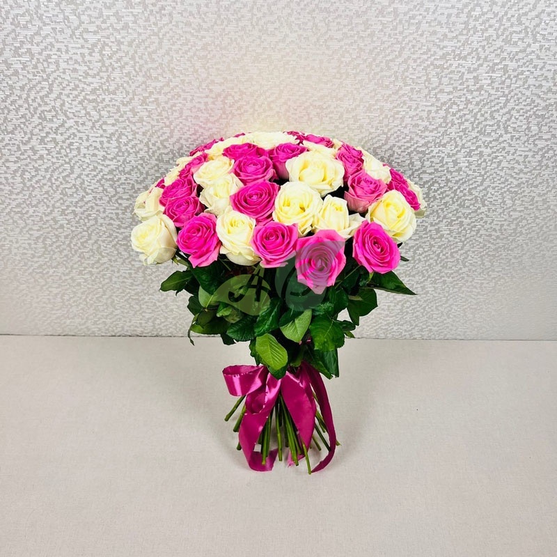 Закажите букет из 51 розовой и белой розы и доставка по Охе будет бесплатной.