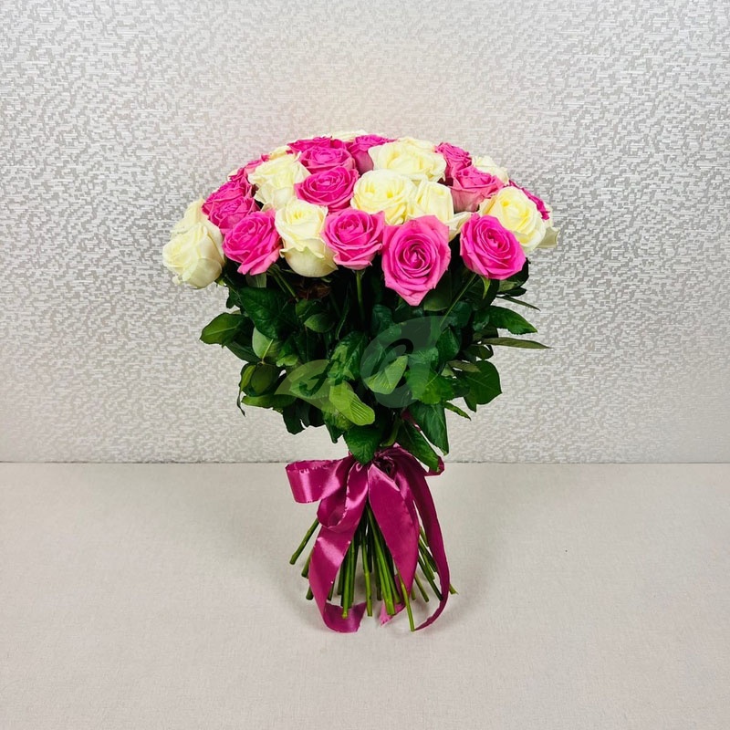 Очаровательный букет собранный преимущественно из 51 белой и розовой розы станет великолепным подарком на праздник или День рождения. Этот букет несомненно поднимет настроение своими яркими и сочными цветами.
