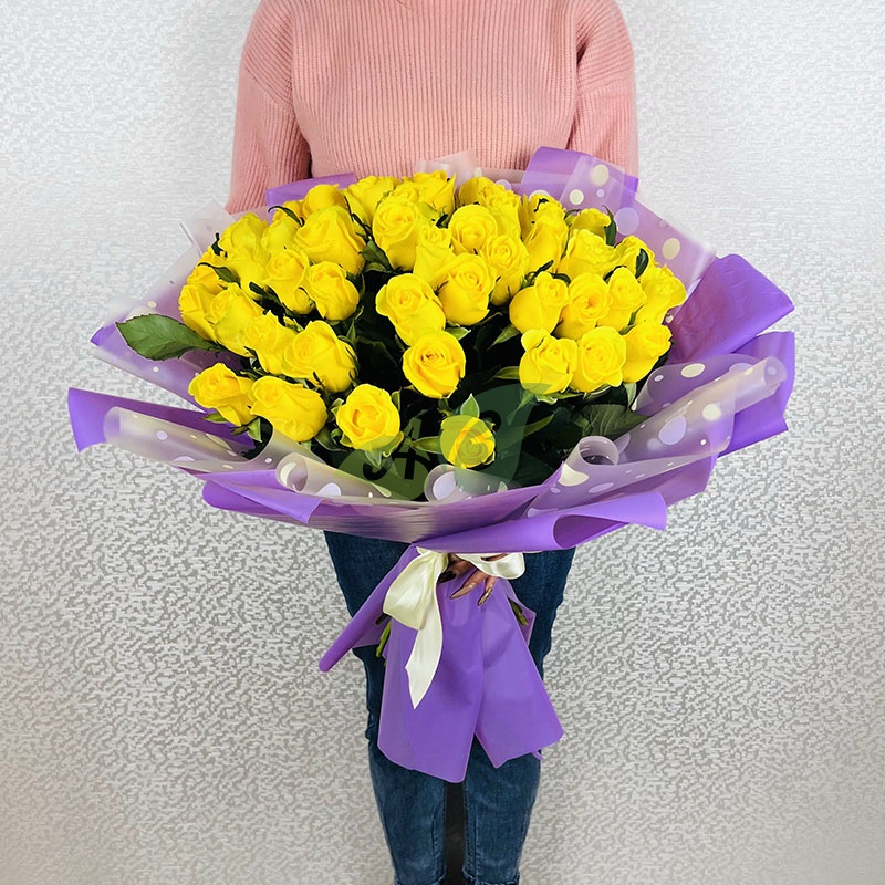 Количество желтых роз в букете вы можете выбрать сами (от 7 до 251). Мы составим композицию и доставим прямо в руки той, кого вы хотите поздравить с праздником роскошным цветами.