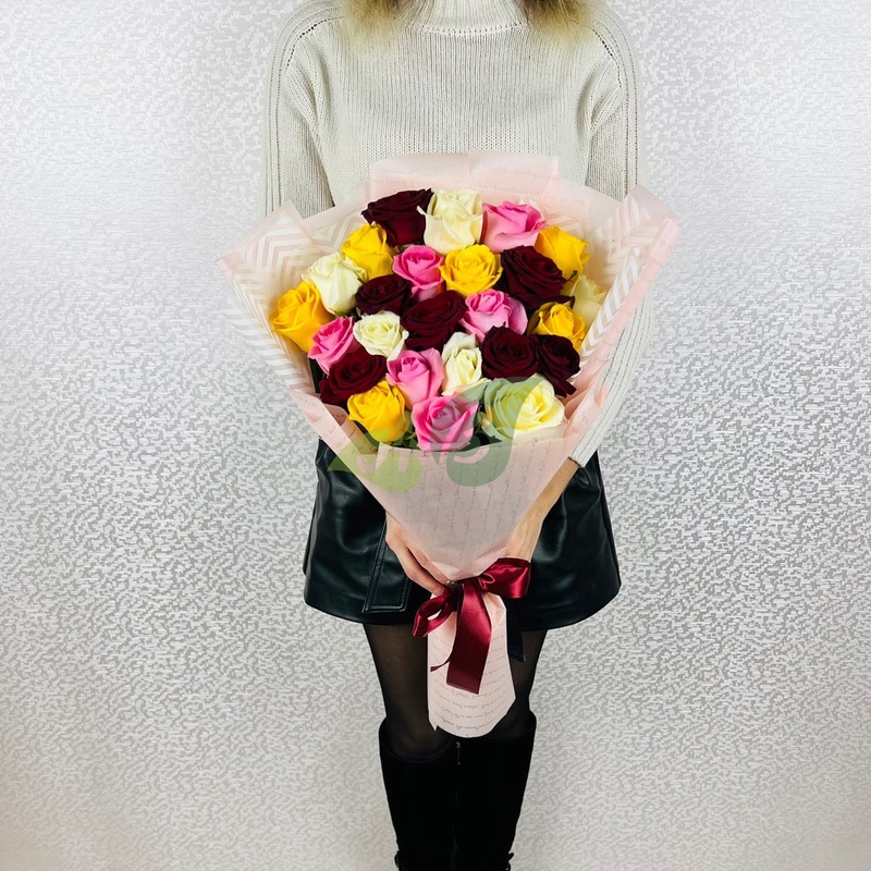 Разноцветный микс роз – это только свежие живые цветы в классической композиции от 15 до 51 штуки.