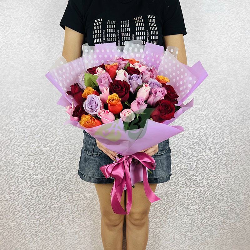 Разноцветный микс роз – это только свежие живые цветы в классической композиции от 15 до 35 штук.