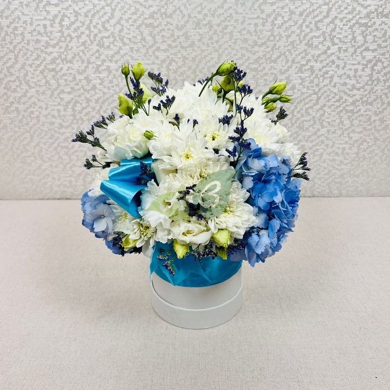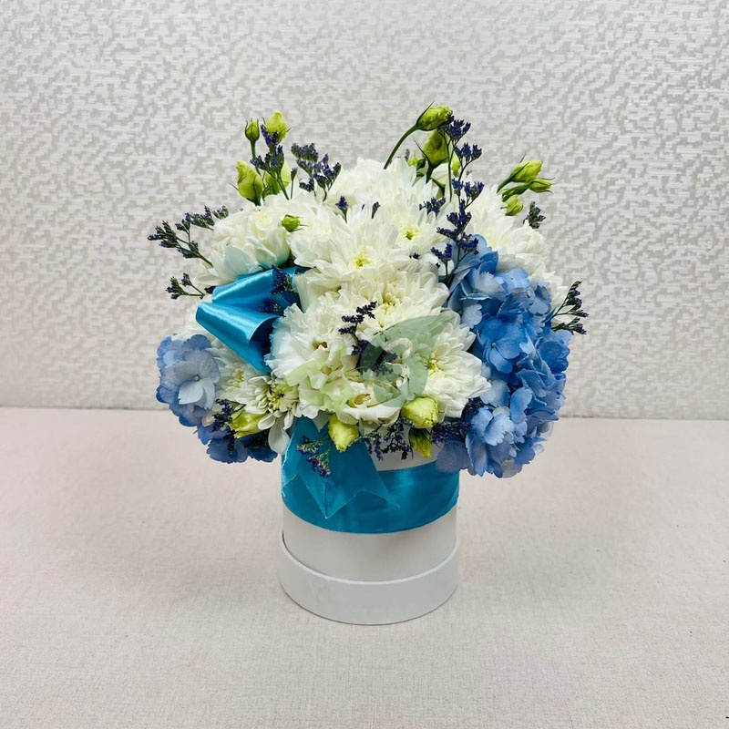 Прелестные цветы в синей коробочке-цилиндре можно заказать для мамы. Ведь именно о ней мы чаще всего вспоминаем, когда нам нужна поддержка. Почему бы и не отблагодарить ее за все ее слезы и волнения? Ведь достаточно заказать нежно-синюю коробочку с хризантемами и розами, чтобы выразить свою любовь в День матери.