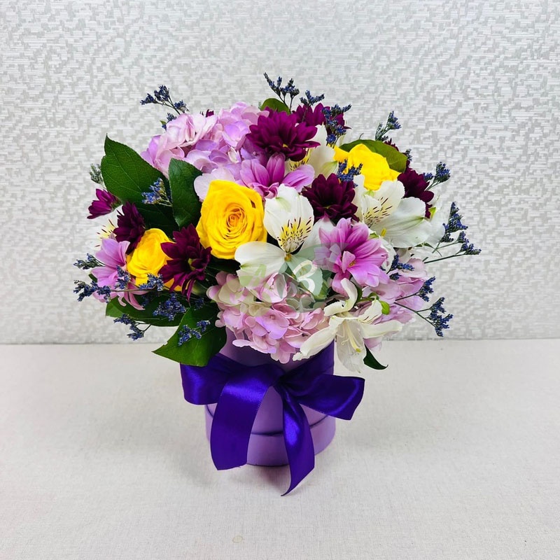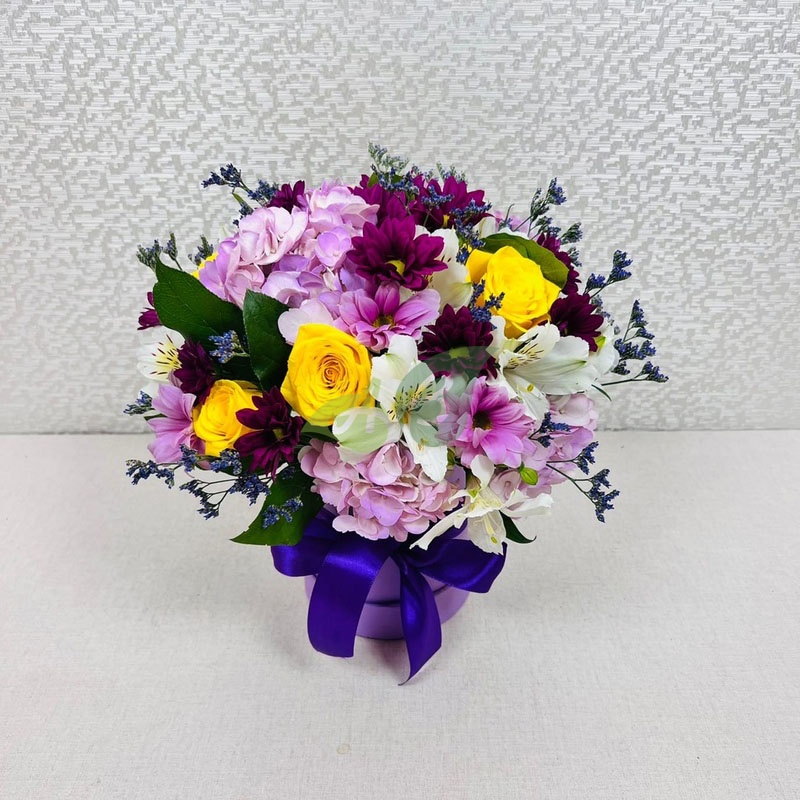 При покупке композиции из фиолетовых цветов в коробке доставка по Охе будет бесплатной.
