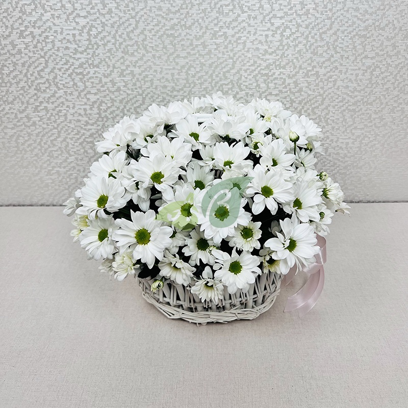 Цветы, подаренные от чистого сердца, всегда приносят радость. Особенно, если это красивые белые кустовые хризантемы, напоминающие ромашки. Именно из них состоит композиция в корзине “Белый вальс”.