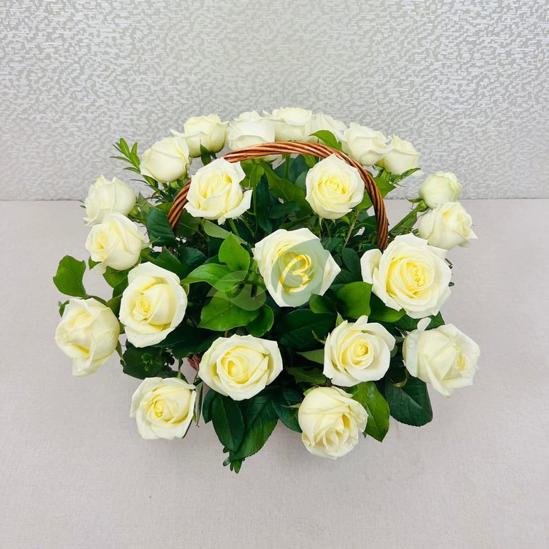 Нежные белые лепестки в обрамлении зелени папоротника – это композиция из роз в корзине. Такой нестандартный букет можно заказать в подарок для жены или мамы. Снежно-белые цветы скажут о вашей любви и преданности.