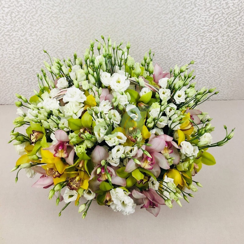 Настоящий цветник в корзине – это композиция “Орхидея и эустома”. Таким шикарным подарком можно сразить самую озорную красавицу. Редкие, экзотические цветы не могут не вызвать радость у той, которую вы любите.