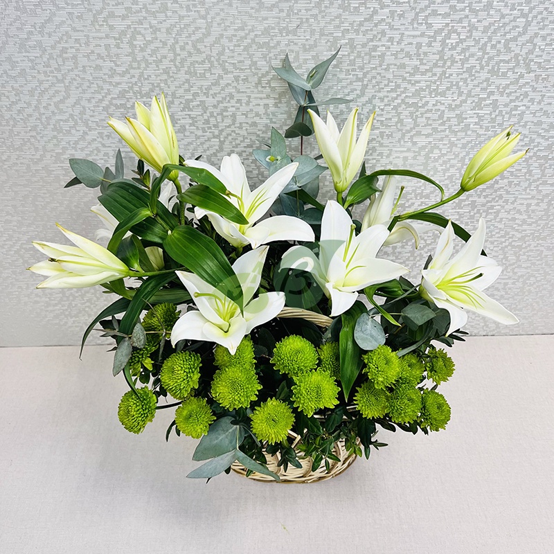 Лилии и зеленые хризантемы в корзине