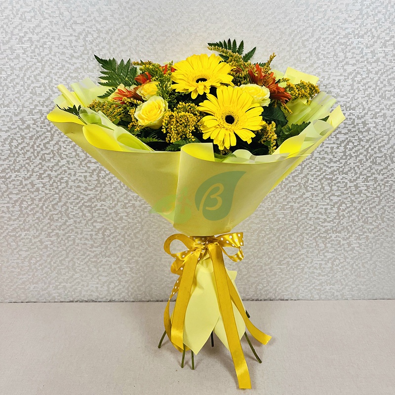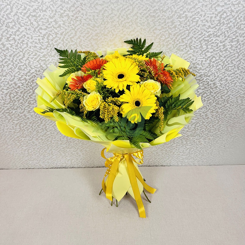 Композиция из цветов роз, гербер яркого желтого оттенка и дополненная зеленью папоротника напоминает солнечных зайчиков на зеленом лугу. Этим букетом можно поздравить с днем рождения тех, кто родился зимой. Он принесет с собой тепло и уют.