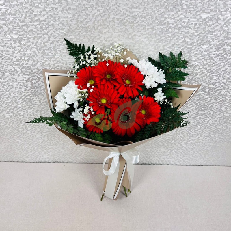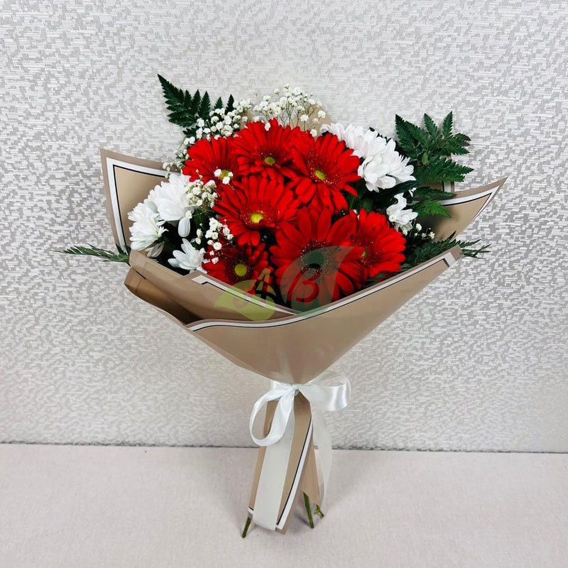 Это небольшая композиция, которую можно дополнить любым подарком или красивой открыткой. Благодаря тому, что герберы и хризантемы неприхотливы, они будут радовать своим видом и тонким ненавязчивым ароматом до 20 дней.