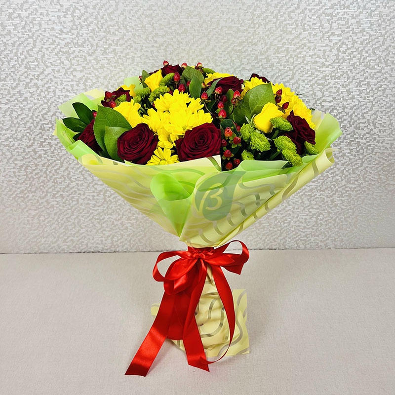 Цветочный подарок – это не просто букет цветов с доставкой. Это изысканная композиция, которую бережно собрали руки наших флористов. 15 роз красного желтого цвета и несколько хризантем в обрамлении насыщенной зелени – это стильно и очень модно.