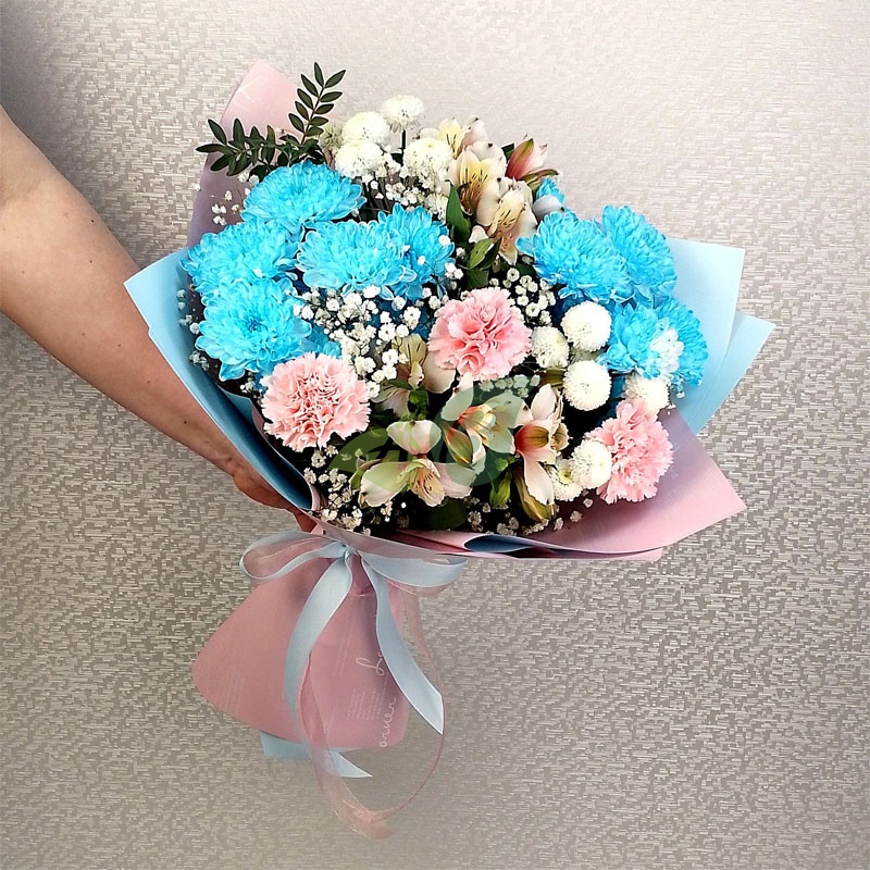 Сочетание голубого, белого и розового цветов замечательно подойдет для подарка как девушке, так и мужчине. Такой букет можно подарить и на выписку из роддома, и на свадьбу молодым.