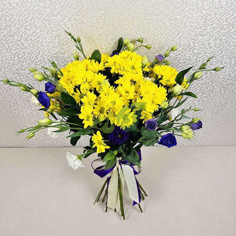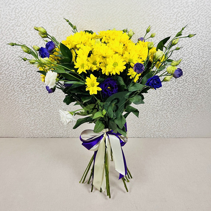 Нужен букет с доставкой в офис? Закажите “Лучезарную улыбку”. Это сборный букет из кустовых хризантем, дополненный эустомый. В нем нет ничего лишнего, лишь красивые цветы и декоративная лента, которая не отвлекает внимание от композиции.
