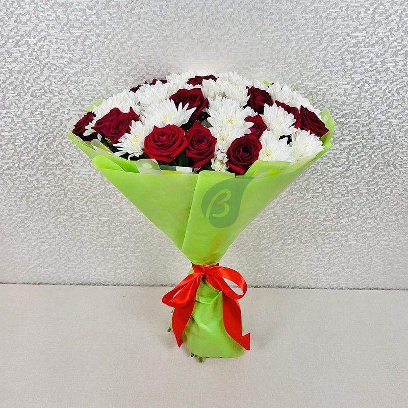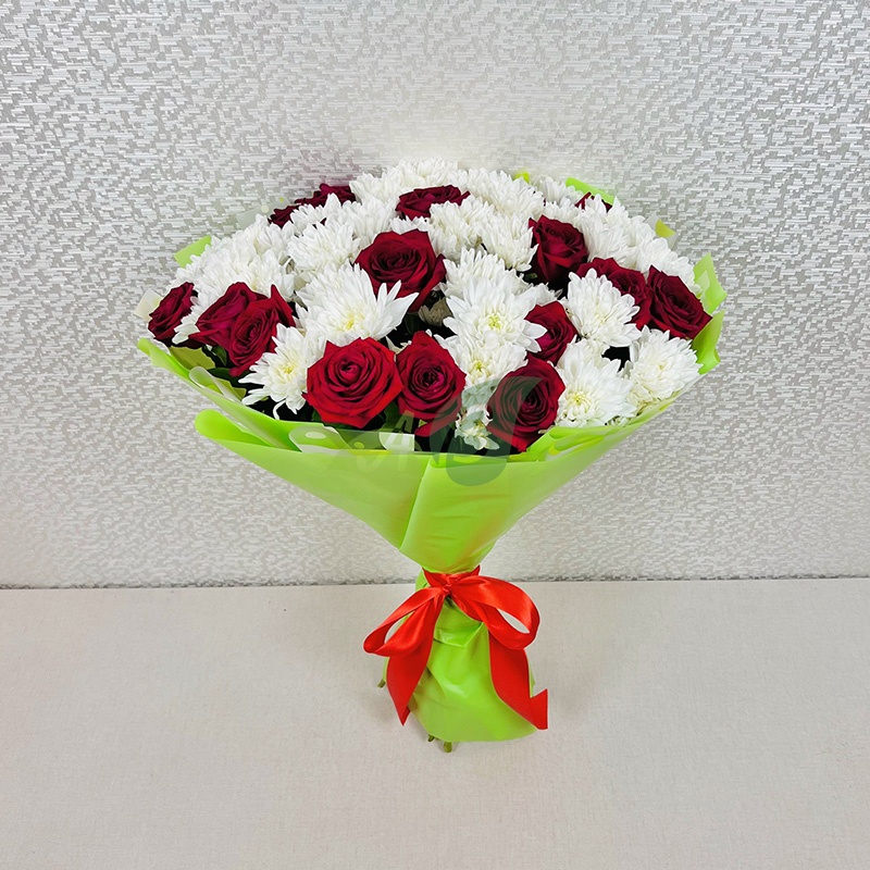 Букет из красных роз и белых хризантем – это шикарная композиция с доставкой на дом от флористов нашего интернет-магазина. Классическое сочетание оттенков придется по вкусу самым капризным красавицам.